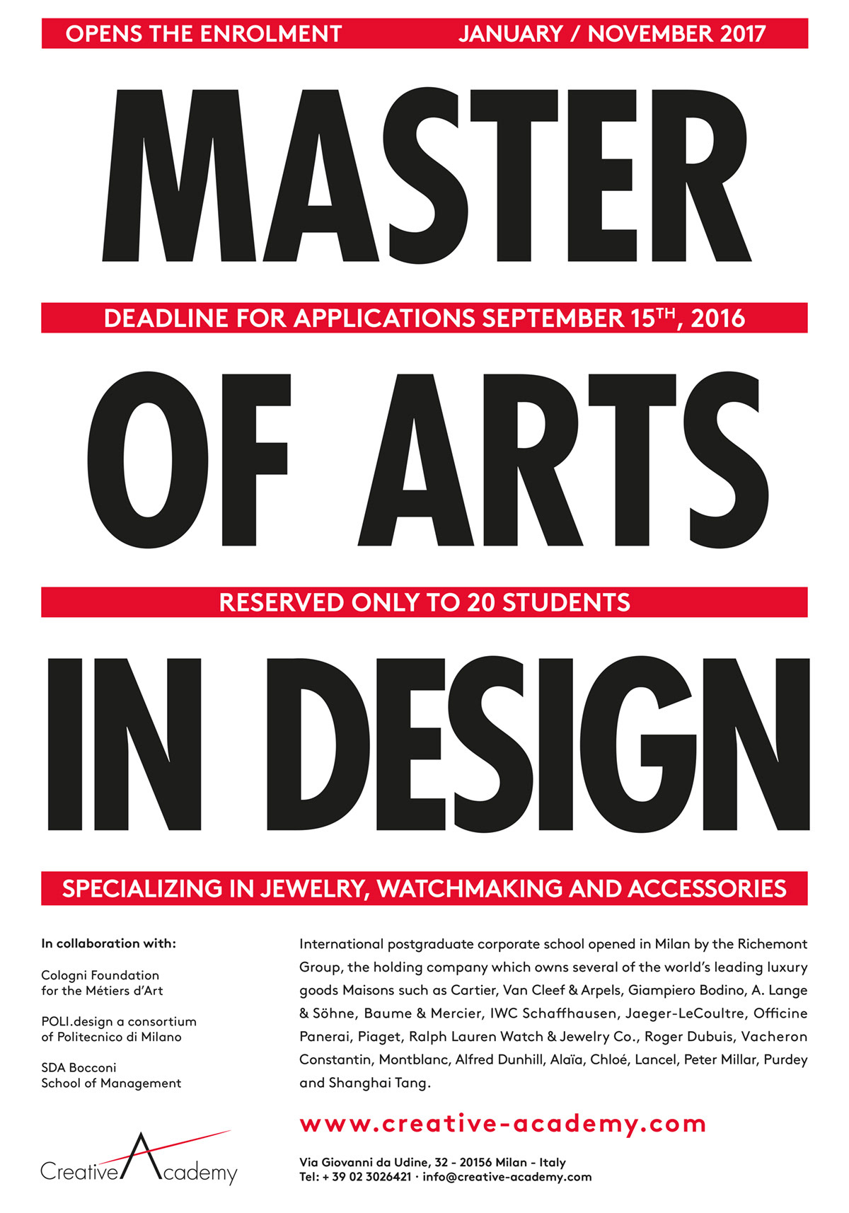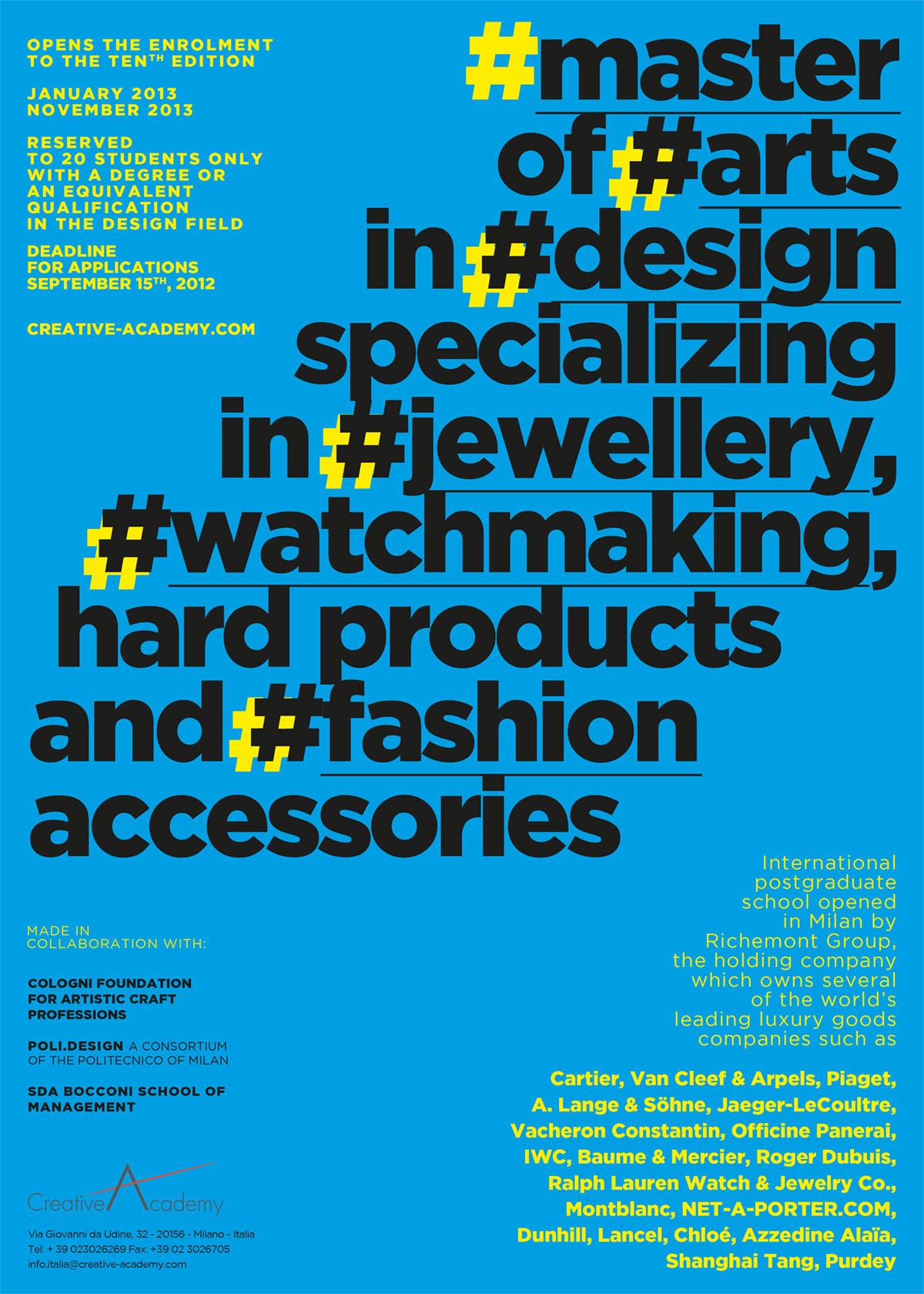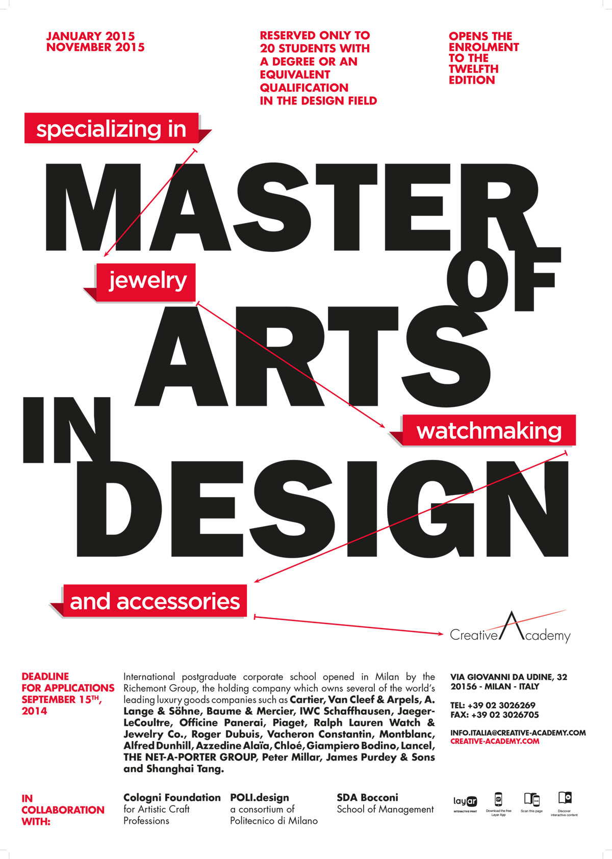 Known for preparing leading designers for the professional world, the Creative Academy is backed by the expertise and prestige of the Richemont Group, one of the world's foremost names in the luxury industry. True to the Richemont ethos, the school challenges students to innovate while upholding the strong sense of tradition and uniqueness that defines each of the Maisons. Since 2011 I’ve design the visual for the recruiting campaign, integrating with an overall management with other mixed media.