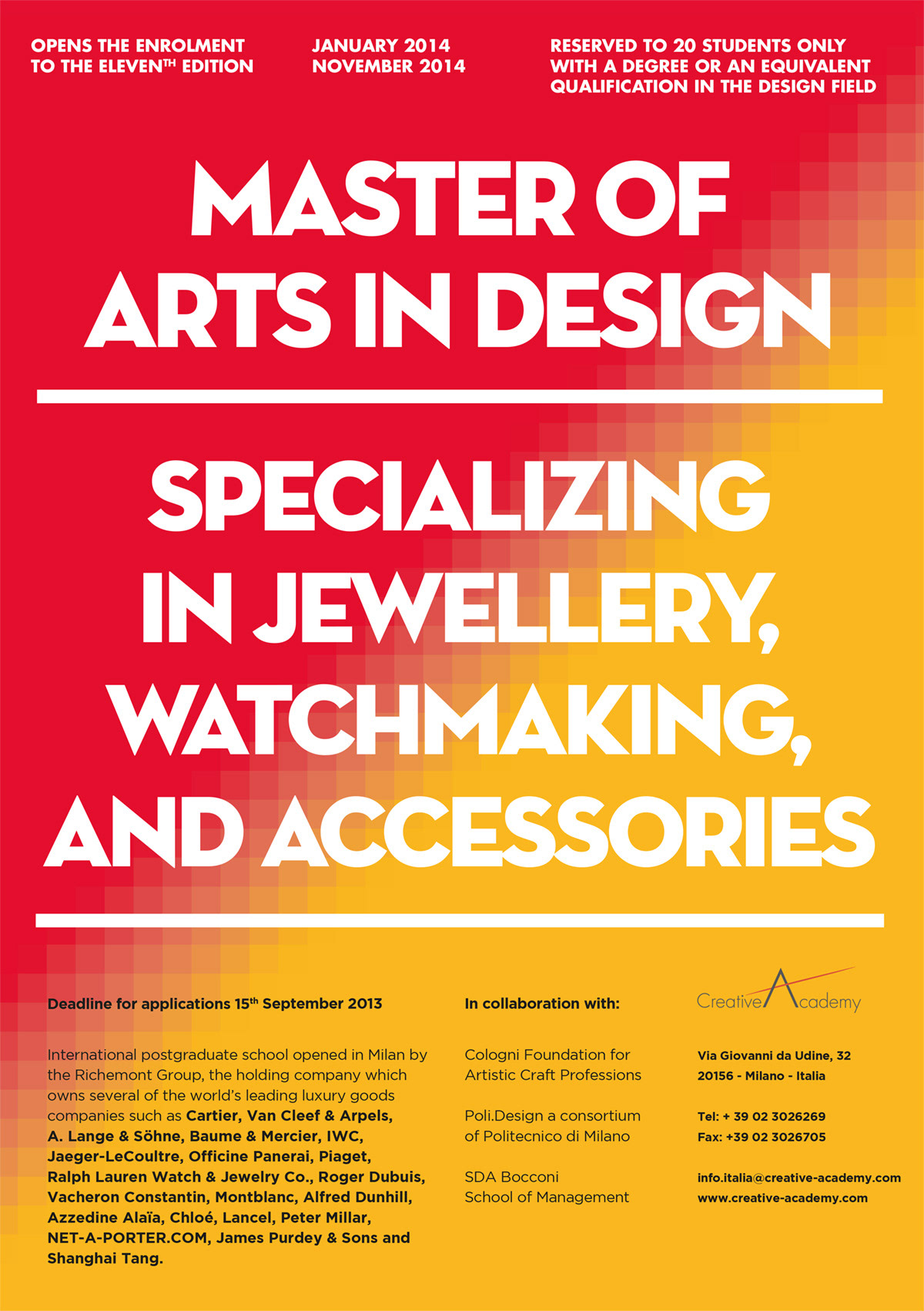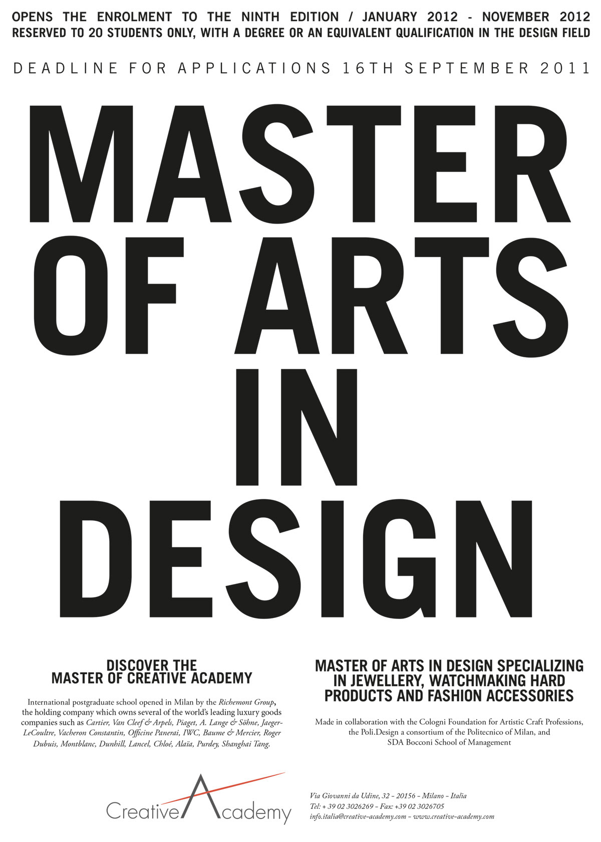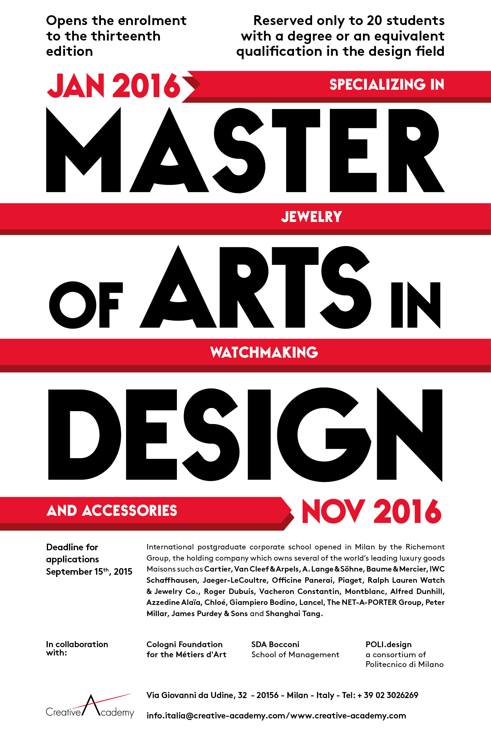 Known for preparing leading designers for the professional world, the Creative Academy is backed by the expertise and prestige of the Richemont Group, one of the world's foremost names in the luxury industry. True to the Richemont ethos, the school challenges students to innovate while upholding the strong sense of tradition and uniqueness that defines each of the Maisons. Since 2011 I’ve design the visual for the recruiting campaign, integrating with an overall management with other mixed media.